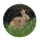 Ein Foto eines Kansas Bunny Rabbit Schuss in der Nähe, der hell und farbenfroh in grünem Gras ist und Unkraut isst. Dies ist auf einem ProfiledInk Dart-Mainboard.