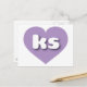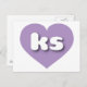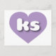 Diese Postkarte zeigt ein formschönes und lebendiges Lavendelherz mit den fett-, weiß- und abgerundeten Kleinbuchstaben ks, eine spielerische Abkürzung für Kansas, den Sonnenblumen-Staat. Die Rückseite der Postkarte ist leer und wartet auf Ihre handgeschriebenen Stimmungen oder Ihren personalisierten Text.