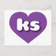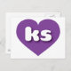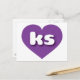 Diese Postkarte weist ein formvolles und lebendiges lila Herz auf, das die fett-, weiß- und abgerundeten Kleinbuchstaben ks enthält, eine spielerische Abkürzung für Kansas, den Sonnenblumen-Staat. Die Rückseite der Postkarte ist leer und wartet auf Ihre handgeschriebenen Stimmungen oder Ihren personalisierten Text.