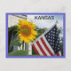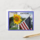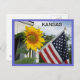 Kansas' Spitzname ist der Sonnenblume-Staat. Schauen Sie sich diese wunderschöne Riesenblume an, die in meinem Vorgarten wächst. Im Hintergrund fliegt die amerikanische Flagge stolz.