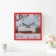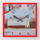 Ein Bild eines Kansas Roten Barns, der hell und farbenfroh mit Baumhirten, blauem Himmel und Schnee ist. Das ist hell und bunt nördlich von Hutchinson Kansas USA draußen im Land. Das ist an einer quadratischen Wand-Uhr.