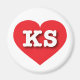 Dieser Magnet zeichnet sich durch ein lebendiges rotes Herz aus, das die fett-, weiß-, Großbuchstaben KS enthält, die offizielle Abkürzung für den Staat von Kansas, dem Sonnenblumen-Staat.