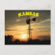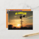 Ein Schuss eines Kansas-Sonnenuntergangs mit einer Windmühle-Silhouette mit Wolken und einem Baum nördlich von Hutchinson Kansas im Land. Das ist auf einer POST CARD.