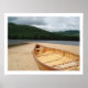 Foto eines Kanus auf einem Sandstrand am See mit Hügeln im Hintergrund.