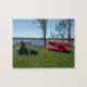 Ein großartiges Geschenk für den Mann in deinem Leben, der Wassersport Liebe. Kanus auf dem Gras. Wasser, Bäume und blauer Himmel.