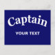 Benutzerdefinierte Postkartenvorlage "Captain", um mit Ihrem eigenen Namen zu personalisieren. Du bist der Chef... Lass mir's! Dies ist eine großartige Postkarte für Kapitäne, Führer, Autoritätspositionen aller Art. Bootskapitäne, Fußball-Kapitän, Trainer, Eltern, Lehrer, Schultrainer, Kontrolle-Freaks... Sie verstehen die Idee. Diese benutzerdefinierte Captain-Postkarte wurde als Vorlage entworfen, was bedeutet, dass Sie alle Textfelder nach Ihren Wünschen ändern oder löschen können. Versuch es mal! Es ist einfach!