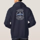 Navy blauer Kapuze mit weißem nautischen Anker, umgeben von einem Seilrand. Über dem Anker befindet sich ein hellblaues Band mit dem Namen Ihres Bootes. Fügen Sie den Titel, z. B. Kapitän, oben und unten einen individuelle Name hinzu.