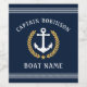 Ein Personalisiertes Set von Weinflaschen-Etiketten mit Ihrem Captain-Rang oder einem anderen Titel und Ihrem Bootsnamen, Familiennamen oder anderen Wunschtexten. Mit eigens dafür entworfenen nautischen Bootsankern, goldenen Blätter und Sternemblem auf dunkelmarineblau. Ändern Sie die Hintergrundfarbe ganz einfach nach Ihrem aktuellen Dekor oder Thema. Es ist eine großartige Ergänzung zum Thema Wassersport für jeden Anlass.