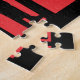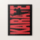 Das Wort Karate in Rot mit einem Kampfkünstler in einer Kick-Silhouette.