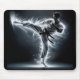 Ein Kampfkünstler spielt einen hohen Tritt, umgeben von dynamischen, leuchtenden Energiewegen vor dunklem Hintergrund