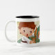 Karatejunge halten hölzern mit anderen, die es zweifarbige tasse
