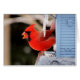 Männlicher Kardinal hockt auf einer eisigen Zufuhr, da Eiszapfen über seinen hellen roten Federn hängen. New Hampshiretierbild gefangen genommen an einem Wintertag im Februar.