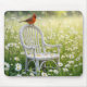 Ein roter Kardinal sitzt elegant auf einem Korbsessel, der von einem Gänsefeld umgeben ist