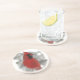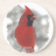 Dieser Untersetzer kennzeichnet einen glänzenden roten Kardinal. Er ist wirklich der König der Hinterhofvögel! Hier wird er auf einer schneebedeckten Schiene schwarze ÖlSonnenblumensamen essend während der Winterschnee-Wirbel um ihn gehockt.