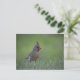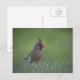 Auf dieser Postkarte befindet sich eine Kardinal im glänzenden Gras, die nach ihrem Partner sucht.