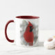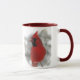 Bilder dieses Tasseneigenschafts-Spiegels eines glänzenden roten Kardinals. Er ist wirklich der König der Hinterhofvögel! Hier wird er auf einer schneebedeckten Schiene schwarze ÖlSonnenblumensamen essend während der Winterschnee-Wirbel um ihn gehockt.