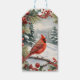 Das Geschenketikett zeigt eine atemberaubende Aquarellmalerei eines blühenden roten Kardinals inmitten üppiger, hügeliger Äste, das ganze Set vor einem Hintergrund von schneebedeckten Bergen und mächtigen immergrünen Bäumen