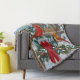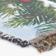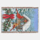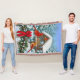 Ein Paar nördliche Rote Kardinäle auf einem schneebedeckten, weißen Zaun mit Weihnachtsgarland und einem kräftigen roten Bogen. Sie feiern an einem Wintervogelleger, der mit Weihnachtsglocken, Band und heiligen Glocken geschmückt ist. Realistisches Kunstwerk von der Künstlerin Crista S. Forest.