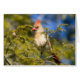 Ein hübscher Kardinal, der auf einem immergrünen Zweig mit einem blauen Himmelshintergrund steht.