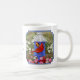 Eine wunderschön bemalte Szene mit roten Kardinälen, die ihre Zuhause in einem hellblauen Vogelhaus machen, umgeben von einem Garten, der mit Hundeholz und farbenfrohen Blume in Rosa, Rot und Weiß blüht. Realistisches Kunstwerk aus einem Gemälde des Künstlers Crista S. Forest.