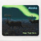 Zwei verfeinerte Bullkaribu (Rangifer tarandus), auch Rentiere genannt, wandern nachts durch die Tundra, während sie für den Winter nach Süden ziehen. Frost ist auf dem Boden und die Nordlichter leuchten über weit entfernten Bergen. Text liest "Alaska" erscheint in leuchtend blau und weiß Fügen Sie Ihren eigenen zusätzlichen Text hinzu.