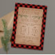 Eine einfache rustikale Hochzeitseinladung im Freien, die eine Illustration von zwei immergrünen Zweigen enthält. Der Hintergrund ist rot und schwarz kariert. Text ist braun. Suchen Sie nach passenden Aufklebern, Porto, uAwg, und speichern Sie die Datumskarten in Jill's Paperie.
