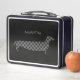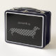 Stilvoller karierter Wursthund auf personalisiertem schwarzem Metallmittagessenkasten.