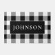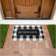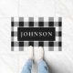Eine Vordertür-Matte mit dem klassischen karierten Büffel in Schwarz und Weiß mit Platz, um sie mit Ihrem eigenen Nachnamen zu personalisieren.
