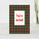 Maßgeschneiderte Weihnachtseinladungskarten mit kariertem, grün-rotem Urlaubsmuster. Inside hat Platz für Ihre individuellen Party-Informationen in einem eleganten Skript. Klicken Sie auf Anpassen, um die Schriftart zu ändern, die Größe zu ändern, Text hinzuzufügen oder zu entfernen, oder um das Design für später retten.
