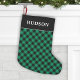 Weihnachts-Strumpf mit einem zweiseitigen, grünen und schwarzen Büffel-Karo karierte Muster mit weißem, benutzerdefiniertem Text, der mit dem Namen eines Familienmitglieds personalisiert werden kann.
