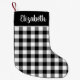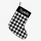Weihnachts-Strumpf zeichnet sich durch ein personalisiertes Design mit einem rustikalen, modernen Schwarz-Weiß-Büffel karierten Karo-Muster und benutzerdefinierten Skriptfamiliennamen Text in Weiß aus. Enthält das gleiche Design auf beiden Seiten des Strumpfs.