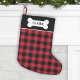 Moderner Weihnachtslieder mit einem personalisierten Design für den Hund, der Haustiere hält, mit einem karierten Büffel-Muster aus rotem und schwarzem Büffel und einem eigenen Monogramm-Namenstext in Schwarz auf einem weißen Knochenschild. Enthält das gleiche Design auf beiden Seiten des Strumpfs.