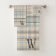 Ein schönes kariertes Bad, Ihr Monogramm-Initial ist unten rechts. Dieses Waschlappen, Handtuch und Badehandtuch Set hat ein braunes und blaues kariertes Design. Kaufen Sie noch heute Ihre!