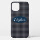 Handy-Gehäuse mit einem karierten, blauen und beigen Muster mit einem blauen Oval, das Sie mit Ihrem Namen anpassen können.