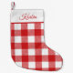 Trendrotes, kariertes Büffel-Muster, Strumpf zu Weihnachten. Weiße Farbblöcke oben mit Vorlagenzeile in roter Kursiv für Namen oder Initialen.