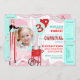 Fun-Karneval Thema Geburtstagskarte Einladung mit Pfahlwandler, Baumwolle Süßigkeiten, Ballons in Rosa, Aqua, Rot und Weiß.