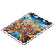 lebhafte und farbenfrohe Parklandschaft. In der Mitte befindet sich ein großes Riesenrad mit dem Wort "SKYLANE". Das Riesenrad ist von verschiedenen skurrilen Strukturen umgeben, darunter Türme und Zelte mit Fahnen. Der Himmel ist voll von Heißluftballons und flauschigen Wolken. Auf den Wegen wird eine Menge Besucher gesehen, die die festliche Umgebung genießen. Das Ambiente ist eine aufregende und unterhaltsame Atmosphäre, typisch für einen Messe- oder Themenpark.