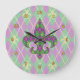 Ein harlequin-Muster von grün und lila verwandelt sich in eine spielerische Raute mit einem Overlay aus goldenen Diamantdächern und Lilie und schafft so ein lustiges und farbenfrohes Muster, das perfekt für alle New Orleans beeinflussten Mardi Gras Feste geeignet ist. Das Muster wird hinter der Silhouette einer Lilie maskiert, um eine lustige letzte Note hinzuzufügen.