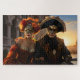 Auf einer Brücke, die einen Kanal überspannt, stehen ein Paar reicher Carnevale-Kostüme mit verzierten Masken, mit barocken Gebäude im Hintergrund, wie die Sonne über die Szene Sets. Schönes, exotisches Puzzle, dass Sie Liebe!