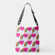 Tasche mit einer niedlichen Körper- oder Schultertasche mit einer sich wiederholenden Tasche von farbenfrohen Regenbogen, die auf der einen Seite von hellrosa Herzen kommen, auf der anderen von einem Single-Herz mit Regenbogen. Originelle Kunstwerke von Buttercup's Bekleidung und Collectables.