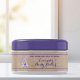 ein Produkt-Etikett mit magerem Karosserietext mit einem Hintergrund im Kraftpapier-Stil und lila Text mit einem Bild von Lavendelfarben-Blume.