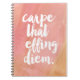 Erleben Sie den Tag mit diesem Notizbuch mit dem Zitat "Carpe That Effing Diem" in einem trendigen weißen Pinselstrich Schriftart vor einem pinkfarbenen und pfirsichfarbenen Waschhintergrund.