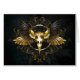 Artitisch gezeichnet, symmetrisch, Schwarz-Gold-Komposition, Vogelflügel, Golden, Vogelschädel mit vergoldeten Mustern auf dunklem, texturiertem Hintergrund.Gotischer Stil