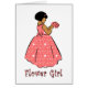 Dies ist ein wertvolles Bild eines Blumenmädchens in einem Korallenkleid mit weißen Sternen, die einen kleinen Strauß Blume tragen.