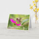 Mutter-Tageskolibri-Karte. Reine, unveröffentlichte Fotografie eines Baby-Kolibris, der auf Nektar eines rosa Gänseblümchens füttert. Herrliche Farbe und perfekter Fokus auf dem Kopf des kleinen Kolibris.