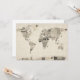 Eine Weltkarte aus einer Sammlung alter Postkarten, in verschiedenen Sprachen und mit Briefmarke aus verschiedenen Ländern, auf antikem Hintergrund.