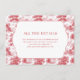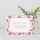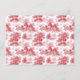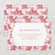 Dies ist ein Bild im Vintage-Stil mit einer eleganten Karte für Hochzeitsdetails vor einem charmanten roten und weißen Toile-Hintergrund. Die komplizierten Muster von Bäumen, Häusern und ländlichen Szenen rufen eine klassische und romantische Atmosphäre hervor. Das zentrale Textfeld mit seinem aufwendigen Rahmen lädt die Gäste ein, mehr über die Unterkünfte und weitere Details auf der Hochzeitswebsite des Paares zu erfahren. Es fühlt sich an, als würde man in ein zeitloses Märchen treten – elegant, einladend und voller Vorfreude auf eine schöne Feier.
