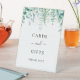 Ein schick weißer Hintergrund. Die Einrichtung besteht aus grünen Eukalyptusbäumen, Waldfarnen. Mit dem Text: Karten und Geschenke, danke!