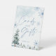Karten und Geschenke-Zeichen. Blauer Winterwunderland Babydusche und Brautparty Schild mit Kiefern und Schneeflocken. Ideal für das Winterwunderland, für die Babydusche und das Brautparty im Winter, sowie für Hochzeiten im Winter.