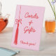 Fügen Sie Ihrer Abschlussfeier eine stilvolle Touch mit diesem eleganten Podestschild Cards & Gifts hinzu! Mit einer handgezeichnet Coquette grad tassel und Bogen verbindet dieses Design Eleganz mit einem modernen, femininen Charme. Der handgeschriebene Kalligraphie-Schriftart verstärkt den anmutigen Look, während die rot-rosa Farbpalette eine lebendige und dennoch elegante Ästhetik schafft, die perfekt zum Feiern der Klasse von 2025 geeignet ist. Dieses Schild ist so konzipiert, dass es Ihr Party perfekt ergänzt. Es hilft Ihnen, den für Geschenke und herzliche Karten bestimmten Bereich zu erkunden. Das robuste Sockelformat macht es einfach auf Tischen, Einstiegsanlagen oder Geschenkstationen anzuzeigen. Personalisieren Sie Ihre Feier mit stilvollen Details, die den Tag noch unvergesslicher machen. Bestellen Sie jetzt Ihre Abschlussfeier mit einer schicken und praktischen Touch!